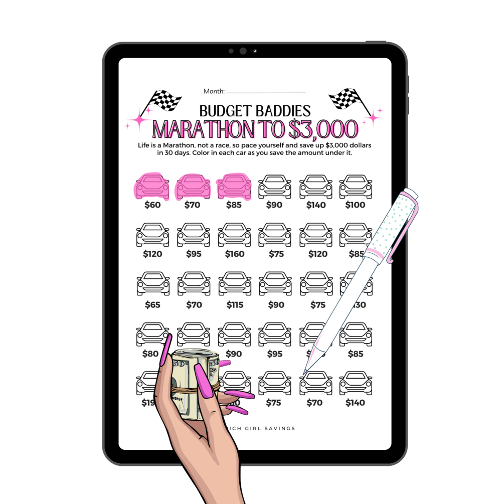 The $3,000 Savings challenge printable is easy to use: There's a total of 30 cars and each one of them represents one day of a month. You don't have to go in order, choose any amount and save it for a particular day. Once you have that amount saved, color it in and see your progress! Instant Download. Print or use digitally.