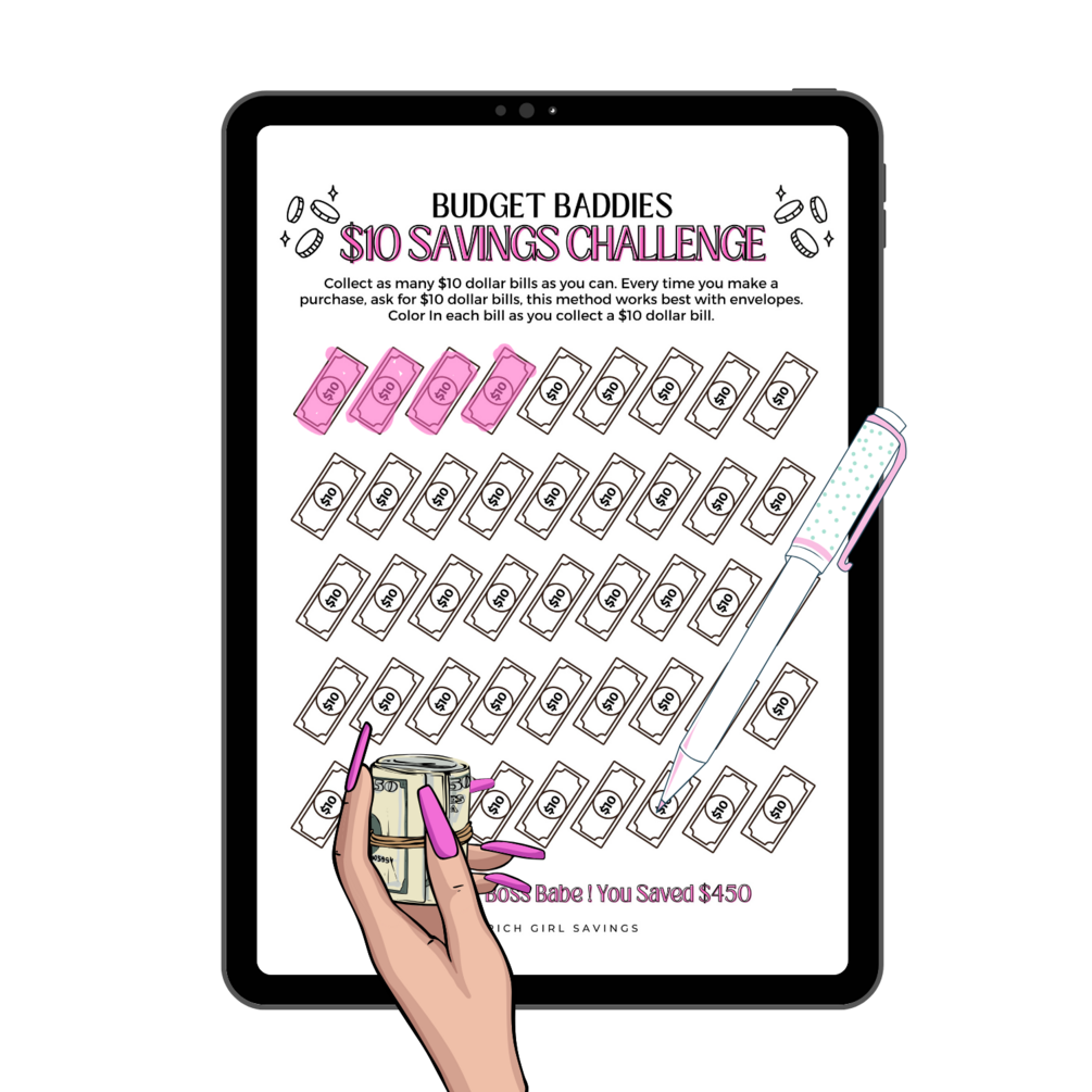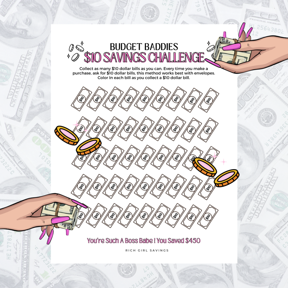 The $10 Money Savings Challenge Printable is easy to use: There's a total of (45) $10 dollar bills, collect and color in as many $10 dollar bills as you can to save $450. Every time you make a purchase, ask for $10 dollar bills in your change, this method works best with envelope saving. Instant Download. Print or use digitally.