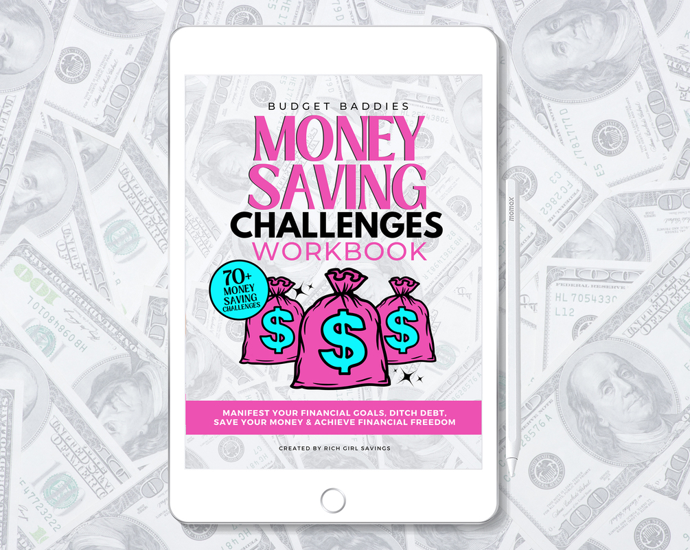 Saving money made easier and enjoyable with our Budget Baddies Money Saving Challenges Workbook. Dedicated to making your saving and budgeting experience fun and rewarding! Stay motivated while you ditch debt and achieve financial freedom with 80+ pages of money saving challenges, debt and expense trackers, no spend days, money manifestations and more!